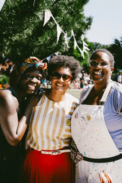Three people are smiling in a group photo at Hastings Museum during an event in 2023.