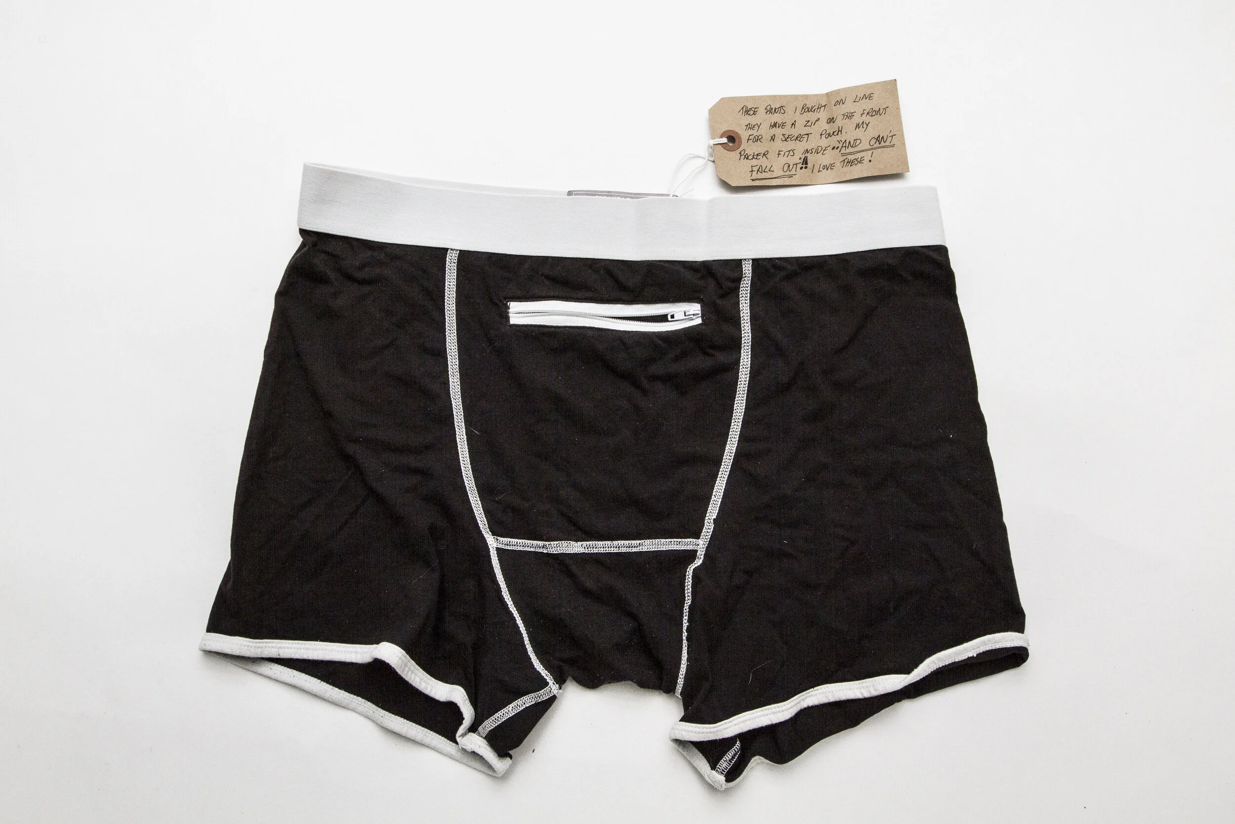 ‘These shorts I bought online: they have a zip on the front for a secret pouch. My packer fits inside and can’t fall out! I love these!’